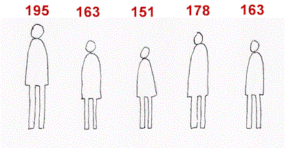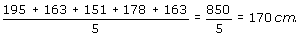 Zo is de gemiddelde lengte van deze vijf mensen het totaal van 195 + 163  + 151 + 178 + 163  = 850 gedeeld door het aantal mensen, dat is 5. Deze vijf zijn dus gemiddeld
