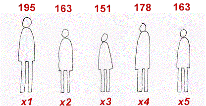 In woorden staat hier: sommeer alle waarden xi van i = 1 tot en met N, en deel vervolgens door N. In het voorbeeld van de lengtes van de vijf mensen geldt dus voor het gemiddelde: