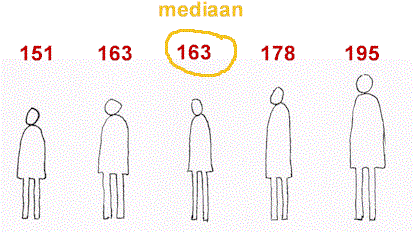Een tweede centrummaat is de mediaan. Dit is letterlijk het midden van een rij getallen, maar dan wel nadat de waarden in volgorde van laag naar hoog zijn geordend.