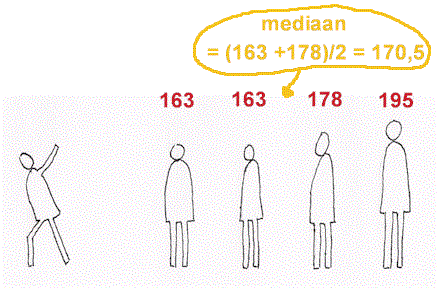 Bij een even aantal getallen is er niet één midden, maar zijn er twee. Het gemiddelde van deze twee is de mediaan.