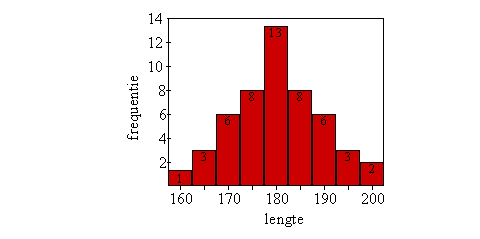 In module 2 maakte je kennis met Eva die een T-shirt voor studenten heeft ontworpen. Om een idee te krijgen hoe lang studenten zijn vroeg ze naar de lengte van 50 mannelijke studenten en 50 vrouwelijke studenten. Hieronder is Eva’s histogram van de lengtes van de 50 mannelijke studenten nogmaals weergegeven. Je kunt zien dat lengtes rond de 180 cm het meest voorkomen bij deze studenten. De top van het histogram ligt boven het klassenmidden van 180 cm. Dit is de modus van het histogram.