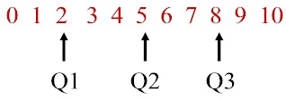 Voor een reeks getallen geldt dus dat 50% van de overige waarden onder de mediaan ligt en 50% erboven. Er zijn natuurlijk ook maten te verzinnen waaronder 40% van de waarden ligt, of 30% of 10%. De maat waaronder 25% van alle waarden in een reeks ligt wordt het eerste kwartiel (Q1) genoemd. Dit is het midden van alle waarden in de reeks die kleiner zijn dan de mediaan. De waarde waaronder 75% van alle waarden in een reeks ligt wordt derde kwartiel (Q3) genoemd. Dit is het midden van alle waarden hoger dan de mediaan. In overeenstemming hiermee wordt de mediaan zelf ook wel het tweede kwartiel (Q2) genoemd. De drie kwartielen delen de gegevens in 4 gelijke groepen. Bij de onderstaande reeks zijn Q1, Q2 en Q3 respectievelijk 2,5 en 8.