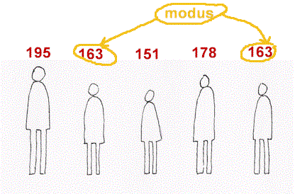De laatste centrummaat die ik wil noemen is de modus. Dit is de waarde die het meest voorkomt. Onder de lengtes van de 5 mensen komt 163 cm twee maal voor, terwijl de andere waarden slechts één keer voorkomen. Dus is 163 de modus.